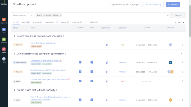 Labrika może automatycznie stworzyć projekt z listą zadań na podstawie kompleksowej analizy SEO Twojej strony. Możesz łatwo zobaczyć, co należy zrobić, aby zoptymalizować swoją stronę i poprawić jej wydajność oraz pozycję w rankingu.